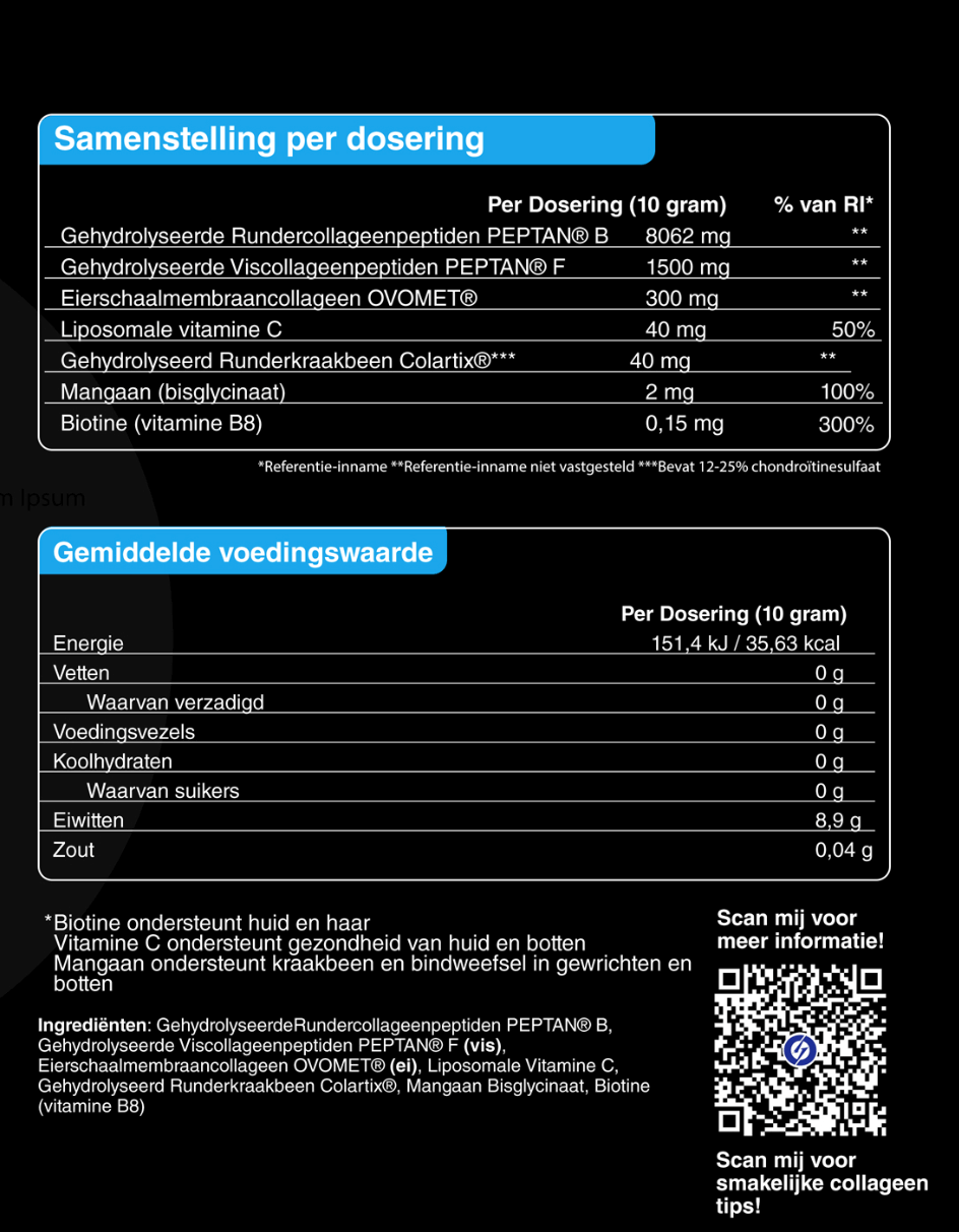 De toevoeging van liposomale vitamine C speelt een cruciale rol in de natuurlijke productie van collageen in het lichaam. Mangaan en biotine dragen verder bij aan de versterking van huid, haar en nagels. Deze ingrediënten zijn zorgvuldig geselecteerd om de opname van collageen te optimaliseren en de effectiviteit te verhogen.